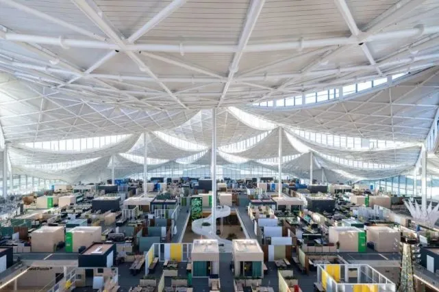 园区建筑由三个结构组成。远远望去,覆盖在每个结构之上,既如鳞片、又像帐篷的面板屋顶无疑是其中最抢眼的部分。这些屋顶由向内弯曲的面板系统组成,这些面板安装了共计50000块银太阳能电池板,可产生近7兆瓦的能量,能满足建筑物每年40%的能源需求。